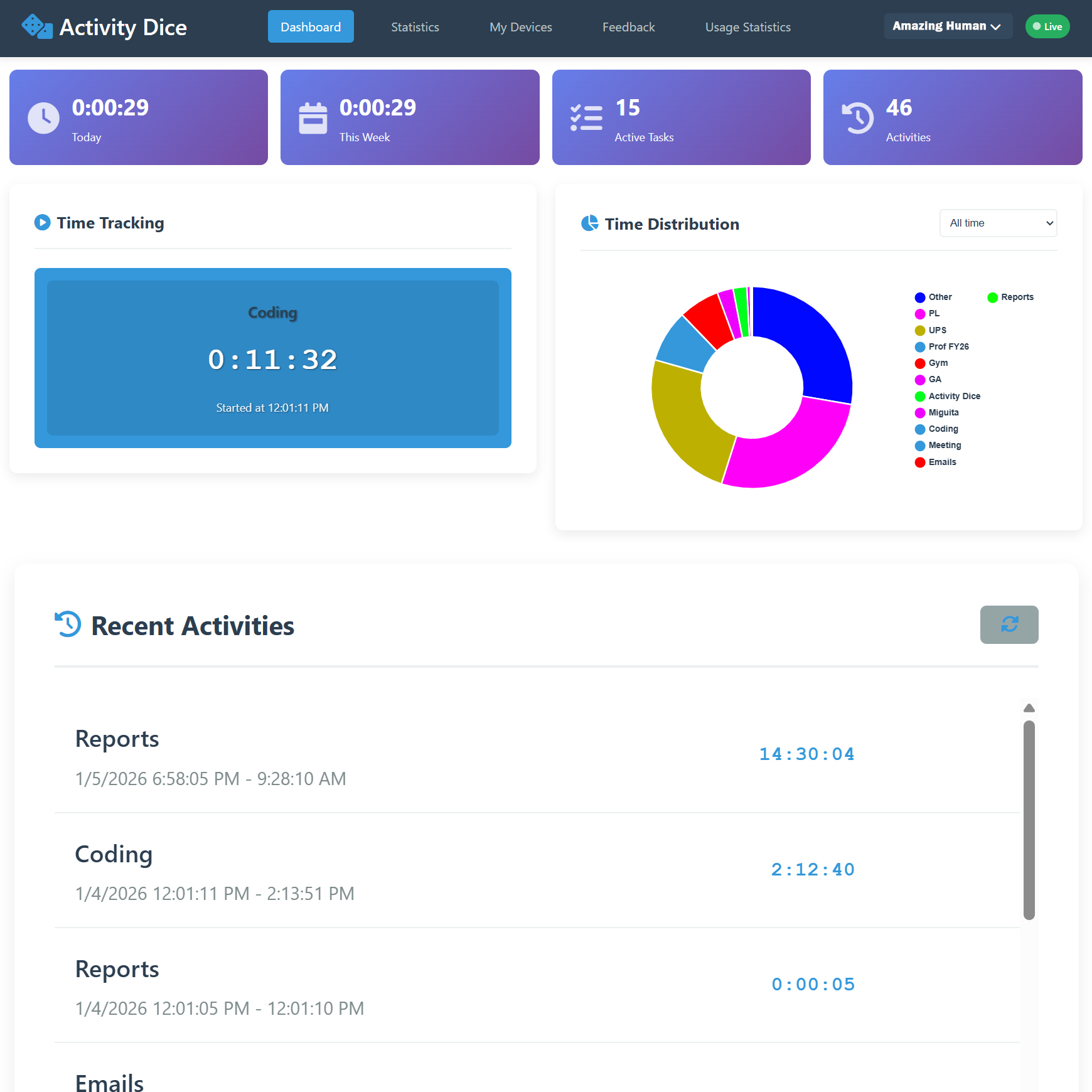 Turn the dice to track your time. The Activity-Dice is a six-sided device, with each face representing a different activity. Simply place the dice with your chosen activity facing up, and it will automatically track the time you spend on it.